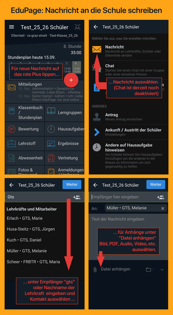 Eltern: Wie kann ich eine Nachricht ganz gezielt an den Klassenvorstand, eine Lehrkraft oder eine/n Mitarbeiter:in des GTS-Teams senden?